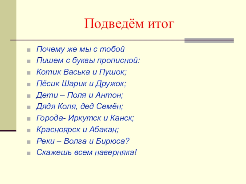 Подведём итогПочему же мы с тобойПишем с буквы прописной:Котик Васька и Пушок;Пёсик Шарик и Дружок;Дети – Поля