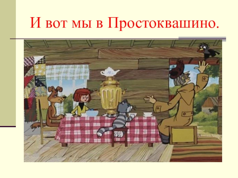 Деревне простоквашино живут друзья. Нас встречает дядя федор. Его друг Кот матроскин пьёт молоко. Добрый Пёс шарик готовит пирог. Любознательный Почтальон печкин разносит письма и посылки.