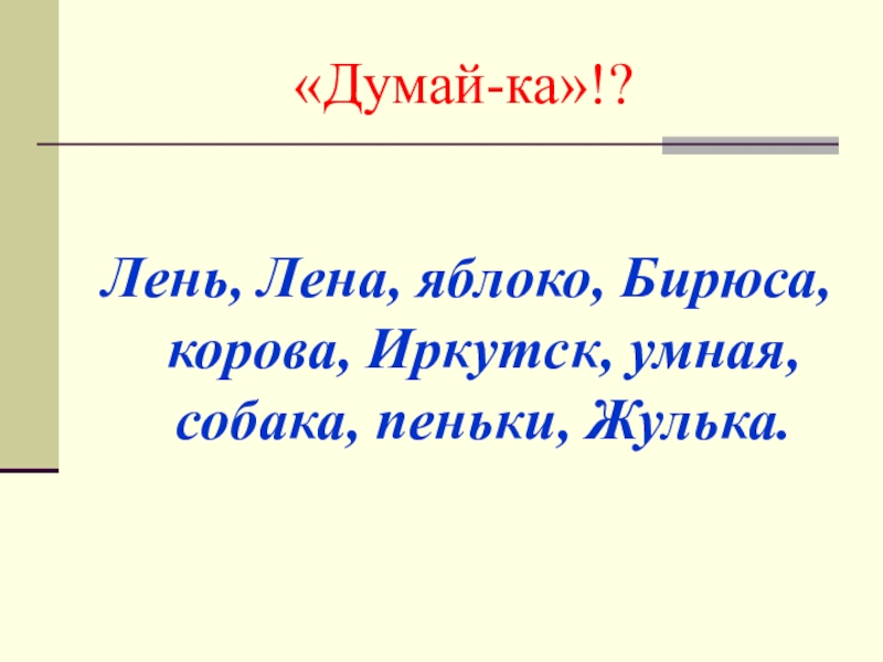 «Думай-ка»!?Лень, Лена, яблоко, Бирюса, корова, Иркутск, умная, собака, пеньки, Жулька.