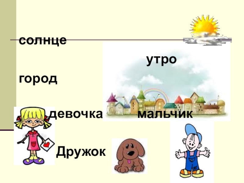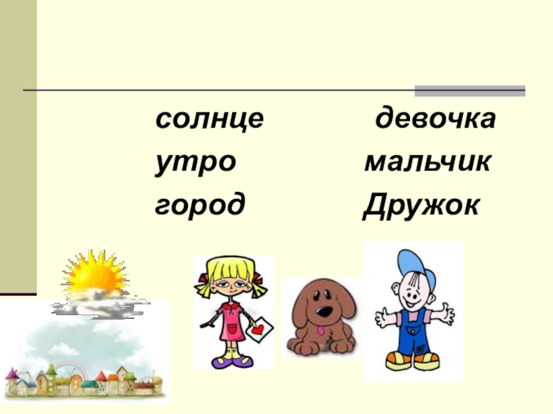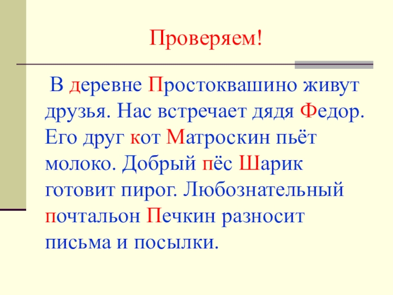 (П, п)ростоквашино живут друзья. Нас встречает дядя (Ф, ф) ёдор. Его друг (К, к)от (М, м) атроскин пьёт молоко. Добрый (П,п)ёс (Ш, ш)арик готовит пирог. Любознательный (П, п) очтальон (П, п) ечкин разносит письма и посылки.