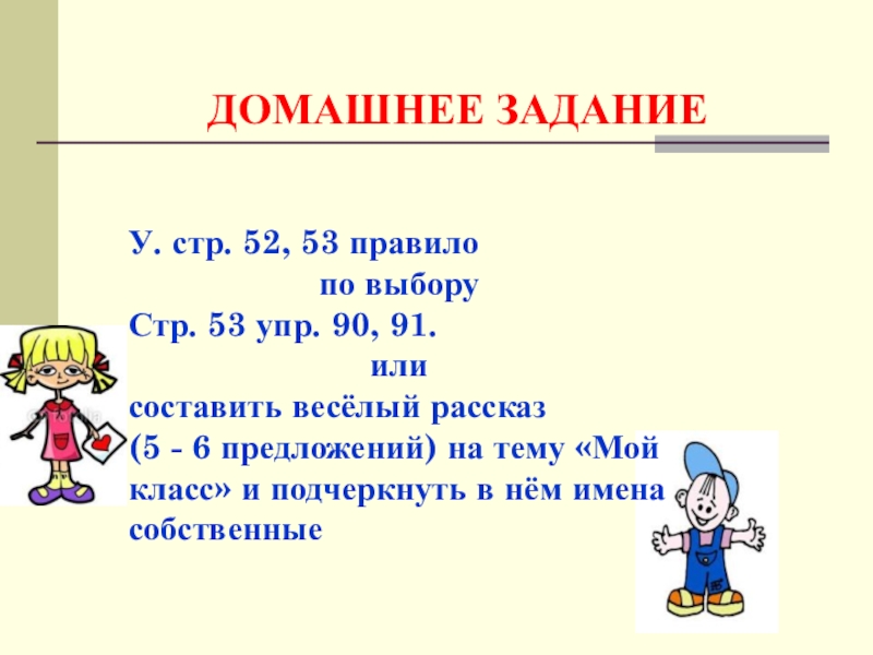 ДОМАШНЕЕ ЗАДАНИЕУ. стр. 52, 53 правилопо выборуСтр. 53 упр. 90, 91. или составить весёлый рассказ (5 -