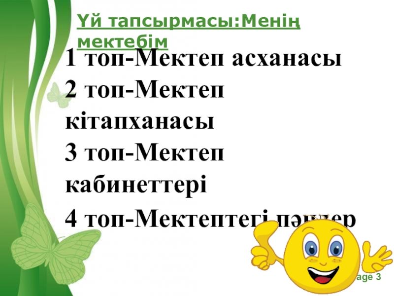 Үй тапсырмасы:Менің мектебім1 топ-Мектеп асханасы2 топ-Мектеп кітапханасы3 топ-Мектеп кабинеттері4 топ-Мектептегі пәндер