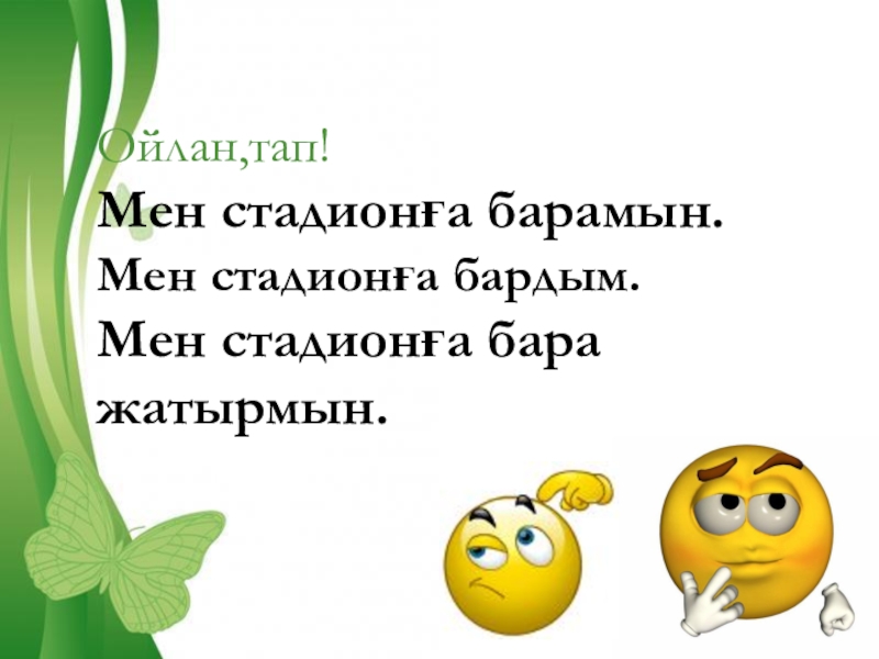 Слайд 9Ойлан,тап! Мен стадионға барамын. Мен стадионға бардым. Мен стадионға бара жатырмын.