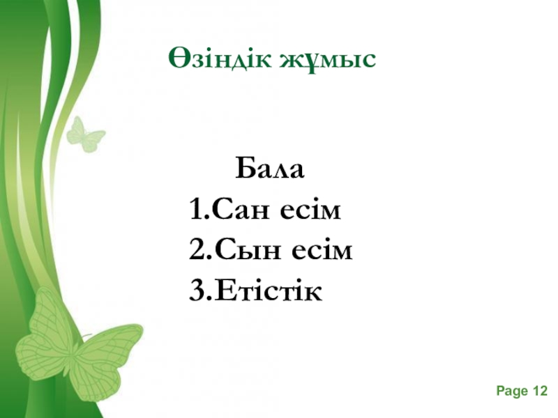 Өзіндік жұмыс Бала 1.Сан есім 2.Сын есім 3.Етістік