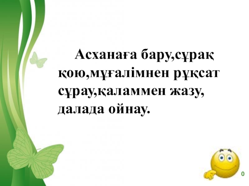 Слайд 10 Асханаға бару,сұрақ қою,мұғалімнен рұқсат сұрау,қаламмен жазу,далада