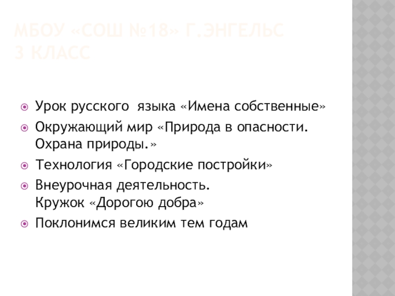МБОУ «СОШ №18» Г.ЭНГЕЛЬС 3 КЛАСС Урок русского языка «Имена собственные»Окружающий мир