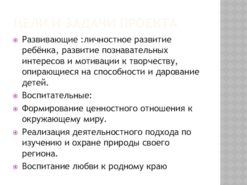 ЦЕЛИ И ЗАДАЧИ ПРОЕКТАРазвивающие :личностное развитие ребёнка, развитие познавательных интересов и мотивации к творчеству, опирающиеся на способности