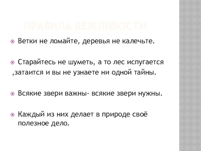 ПРАВИЛА ВЕЖЛИВОСТИВетки не ломайте, деревья не калечьте.Старайтесь не шуметь, а то лес испугается,затаится и вы