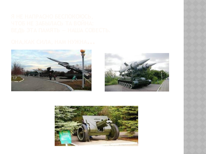 Слайд 25Я НЕ НАПРАСНО БЕСПОКОЮСЬ, ЧТОБ НЕ ЗАБЫЛАСЬ ТА ВОЙНА: ВЕДЬ ЭТА ПАМЯТЬ —