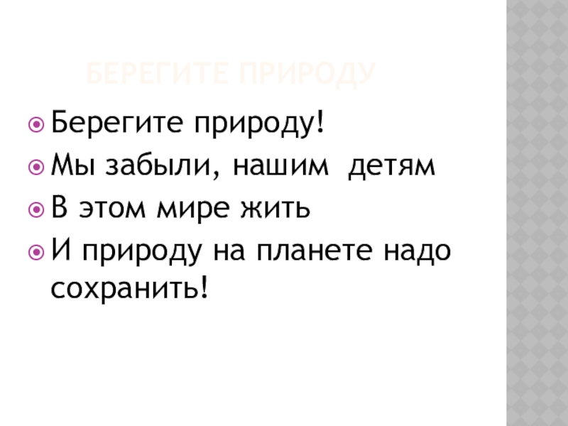 БЕРЕГИТЕ ПРИРОДУ Берегите природу!Мы забыли, нашим детямВ этом мире жить И природу на планете