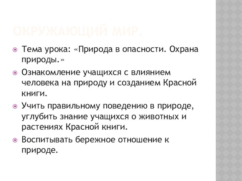ОКРУЖАЮЩИЙ МИР.Тема урока: «Природа в опасности. Охрана природы.»Ознакомление учащихся с влиянием человека на природу и созданием Красной