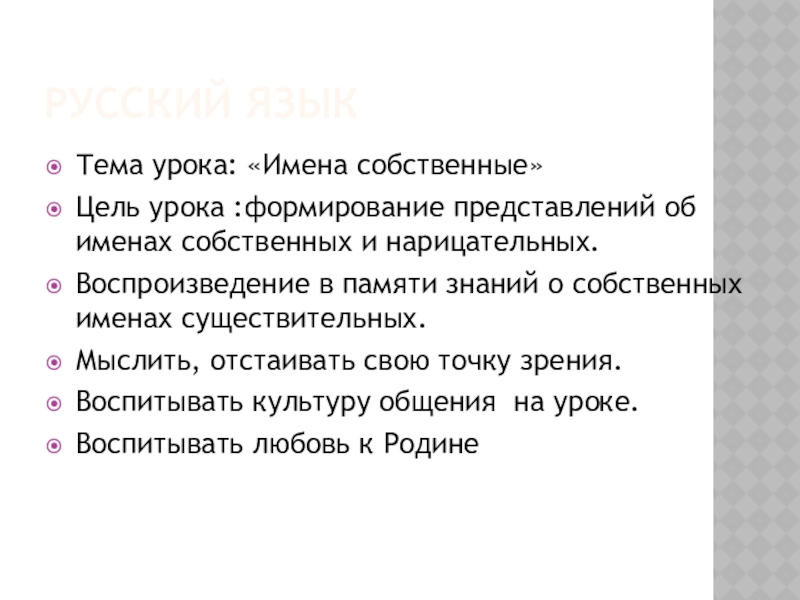 РУССКИЙ ЯЗЫКТема урока: «Имена собственные»Цель урока :формирование представлений об именах собственных и нарицательных.Воспроизведение в памяти знаний о