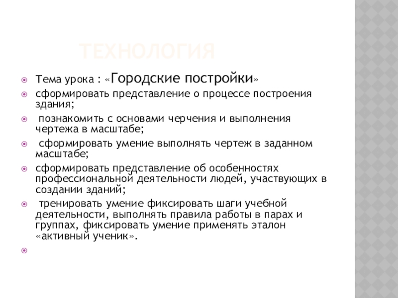 ТЕХНОЛОГИЯ Тема урока : «Городские постройки»сформировать представление о процессе построения здания; познакомить