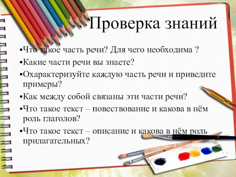 Проверка знанийЧто такое часть речи? Для чего необходима ?Какие части речи вы знаете?Охарактеризуйте каждую часть речи и приведите примеры?Как между собой связаны эти части речи?Что такое текст – повествование и какова в нём роль глаголов?Что такое