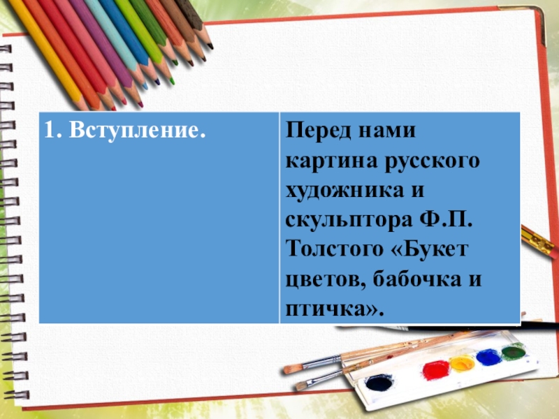 Сочинение по картине Ф.П. Толстого «Букет цветов, бабочка и птичка»1. Вступление.2. Основная часть.3. Концовка