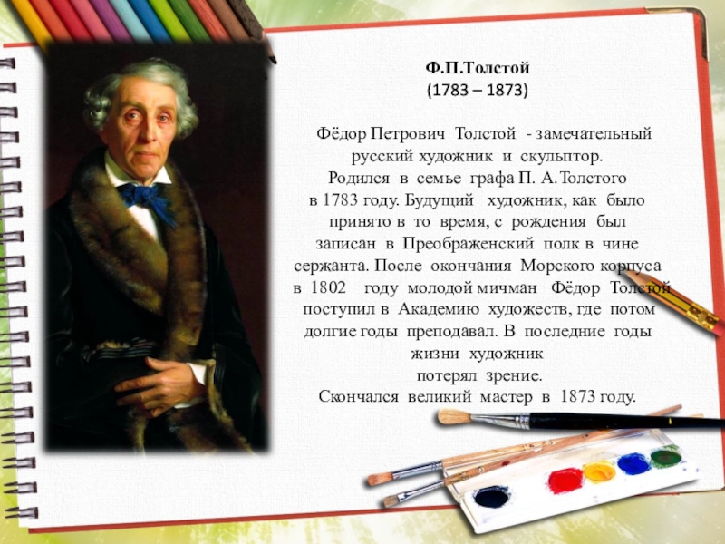 и  скульптор. Родился  в  семье  графа П. А.Толстого в 1783 году. Будущий   художник, как  было принято в  то  время, с  рождения  был  записан  в  Преображенский  полк в  чине  сержанта. После  окончания  Морского корпуса в  1802 году  молодой мичман   Фёдор  Толстой  поступил в  Академию  художеств, где  потом    долгие годы  преподавал. В  последние  годы  жизни  художник  потерял  зрение.  Скончался  великий  мастер  в  1873 году.