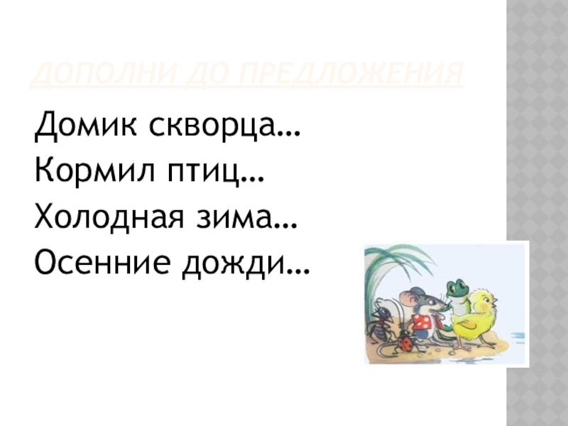 ДОПОЛНИ ДО ПРЕДЛОЖЕНИЯДомик скворца…Кормил птиц…Холодная зима…Осенние дожди…