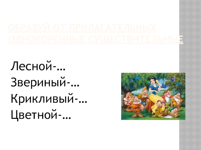 ОБРАЗУЙ ОТ ПРИЛАГАТЕЛЬНЫХ  ОДНОКОРЕННЫЕ СУЩЕСТВИТЕЛЬНЫЕЛесной-…Звериный-…Крикливый-…Цветной-…