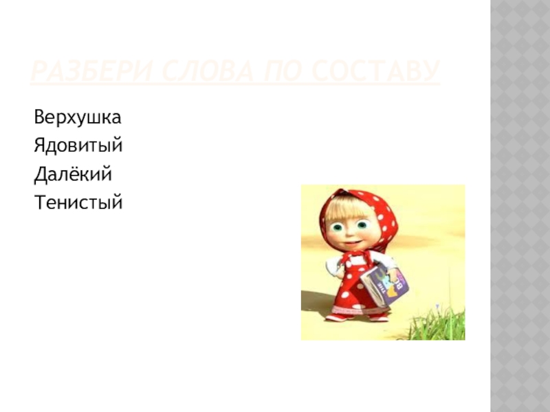 РАЗБЕРИ СЛОВА ПО СОСТАВУВерхушкаЯдовитыйДалёкийТенистый