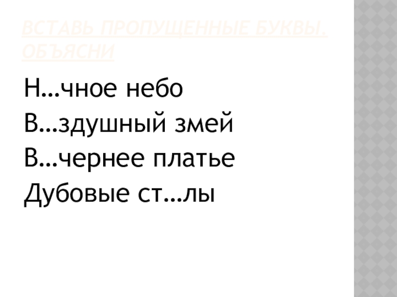 ВСТАВЬ ПРОПУЩЕННЫЕ БУКВЫ.  ОБЪЯСНИН…чное небоВ…здушный змейВ…чернее платьеДубовые ст…лы