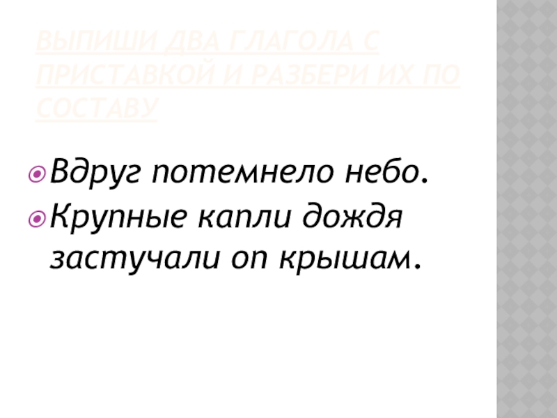 ВЫПИШИ ДВА ГЛАГОЛА С ПРИСТАВКОЙ И РАЗБЕРИ ИХ ПО СОСТАВУВдруг потемнело небо.Крупные капли дождя застучали оп крышам.