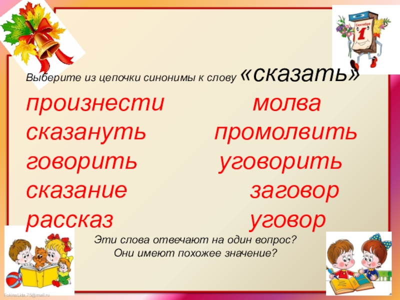 Слайд 6Выберите из цепочки синонимы к слову «сказать»