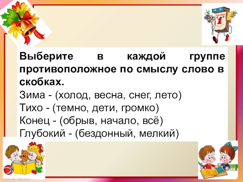 Слайд 14Выберите в каждой группе противоположное по смыслу слово в скобках.