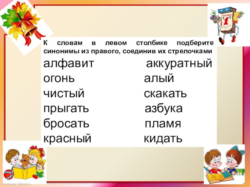 Слайд 8К словам в левом столбике подберите синонимы из правого, соединив их