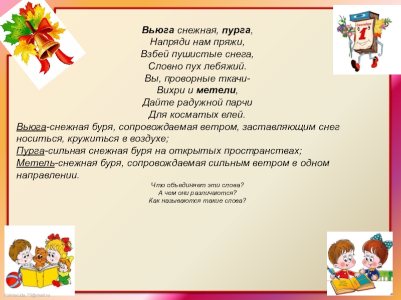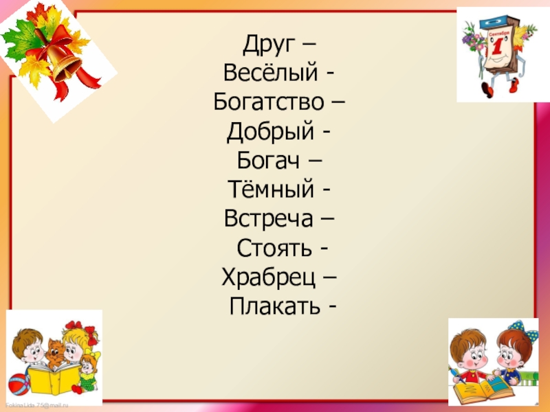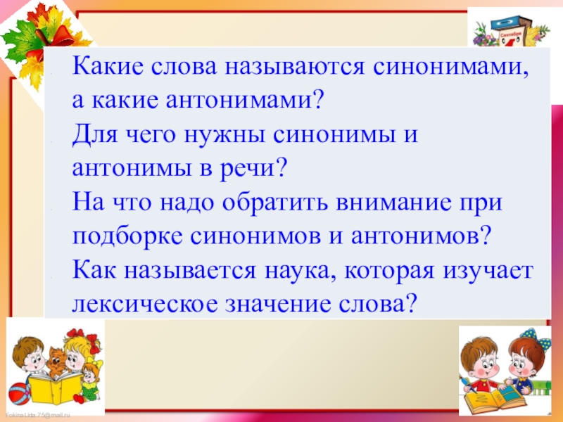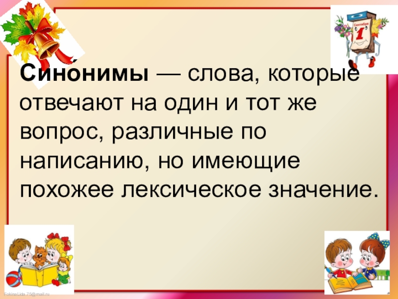 Слайд 7Сино́нимы — слова, которые отвечают на один и тот же вопрос,
