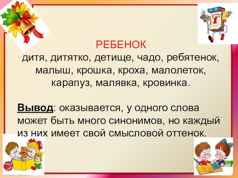 Вывод: оказывается, у одного слова может быть много синонимов, но каждый из них имеет свой смысловой оттенок.