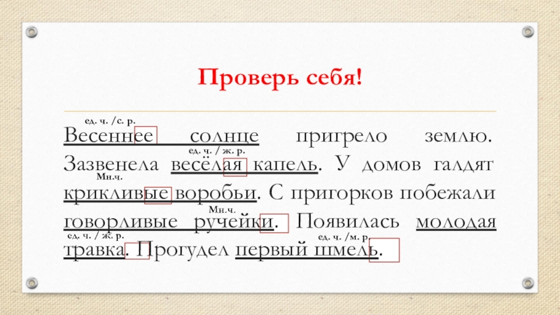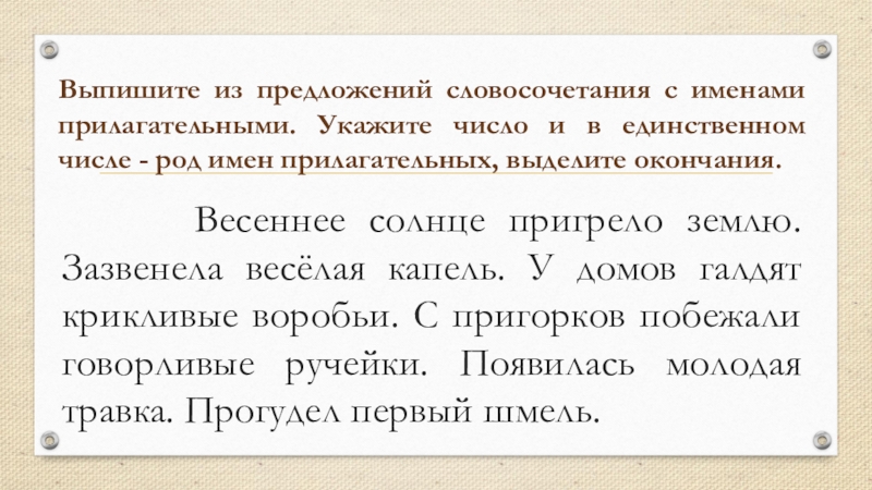 Весеннее солнце пригрело землю. Зазвенела весёлая капель. У домов галдят крикливые воробьи. С пригорков побежали говорливые ручейки. Появилась молодая травка. Прогудел первый шмель.