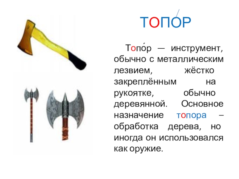 Топо́р — инструмент, обычно с металлическим лезвием, жёстко закреплённым на рукоятке, обычно деревянной. Основное назначение топора – обработка дерева, но иногда он использовался как оружие.