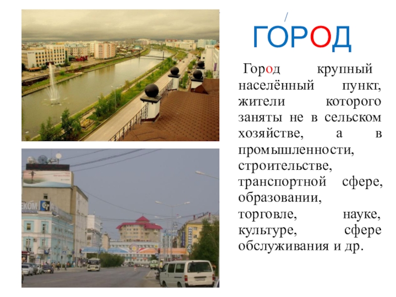 Город крупный населённый пункт, жители которого заняты не в сельском хозяйстве, а в промышленности, строительстве, транспортной сфере, образовании, торговле, науке, культуре, сфере обслуживания и др.
