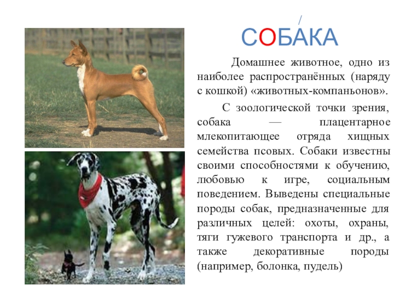 С зоологической точки зрения, собака — плацентарное млекопитающее отряда хищных семейства псовых. Собаки известны своими способностями к обучению, любовью к игре, социальным поведением. Выведены специальные породы собак, предназначенные для различных целей: охоты, охраны, тяги гужевого транспорта и др., а также декоративные породы (например, болонка, пудель)