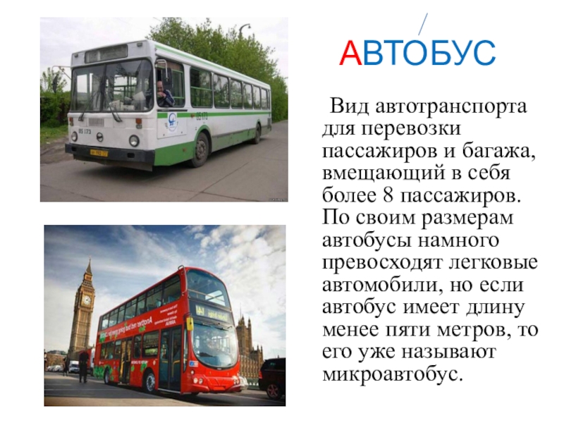 Вид автотранспорта для перевозки пассажиров и багажа, вмещающий в себя более 8 пассажиров. По своим размерам автобусы намного превосходят легковые автомобили, но если автобус имеет длину менее пяти метров, то его уже называют микроавтобус.