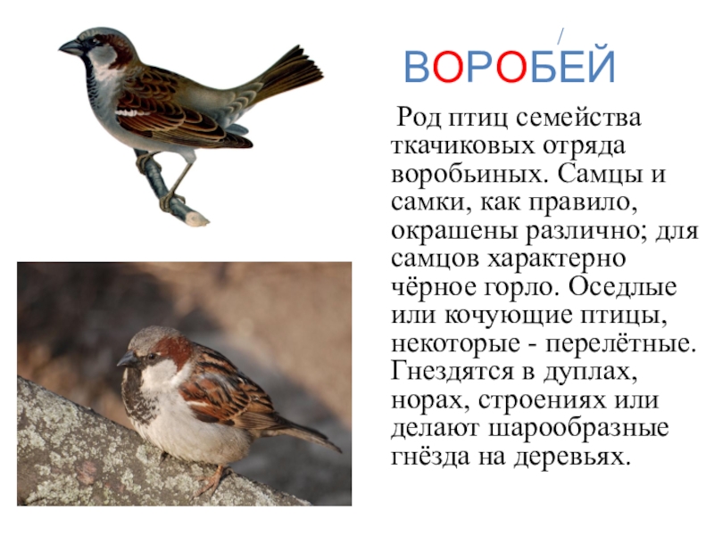Род птиц семейства ткачиковых отряда воробьиных. Самцы и самки, как правило, окрашены различно; для самцов характерно чёрное горло. Оседлые или кочующие птицы, некоторые - перелётные. Гнездятся в дуплах, норах, строениях или делают шарообразные гнёзда на деревьях.