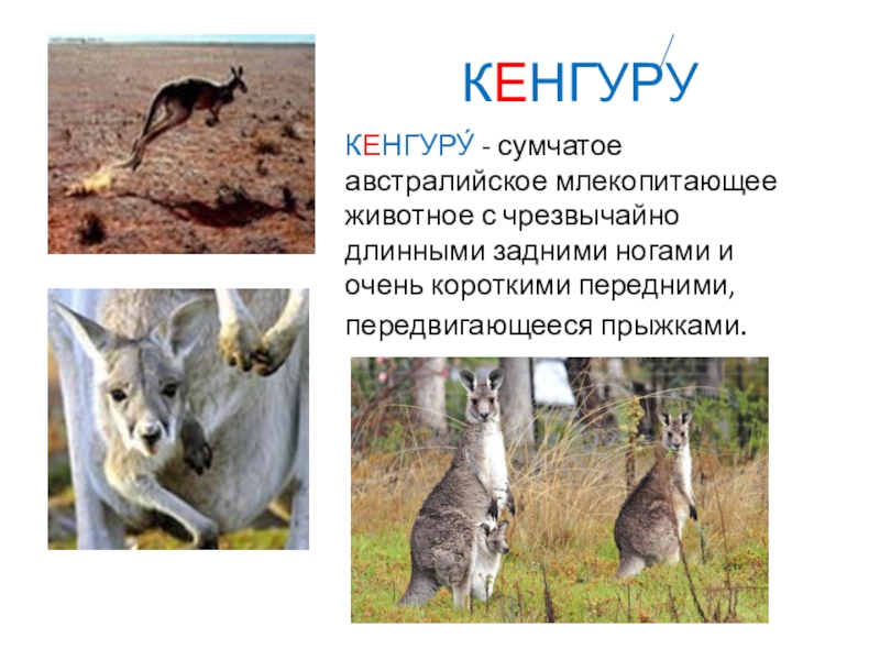 КЕНГУРУ́ - сумчатое австралийское млекопитающее животное с чрезвычайно длинными задними ногами и очень короткими передними, передвигающееся прыжками.