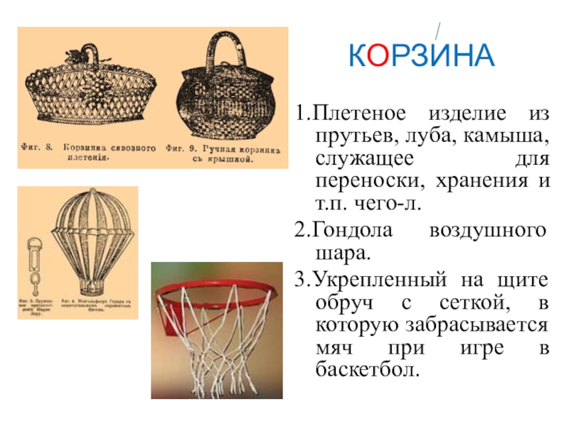 3.Укрепленный на щите обруч с сеткой, в которую забрасывается мяч при игре в баскетбол.