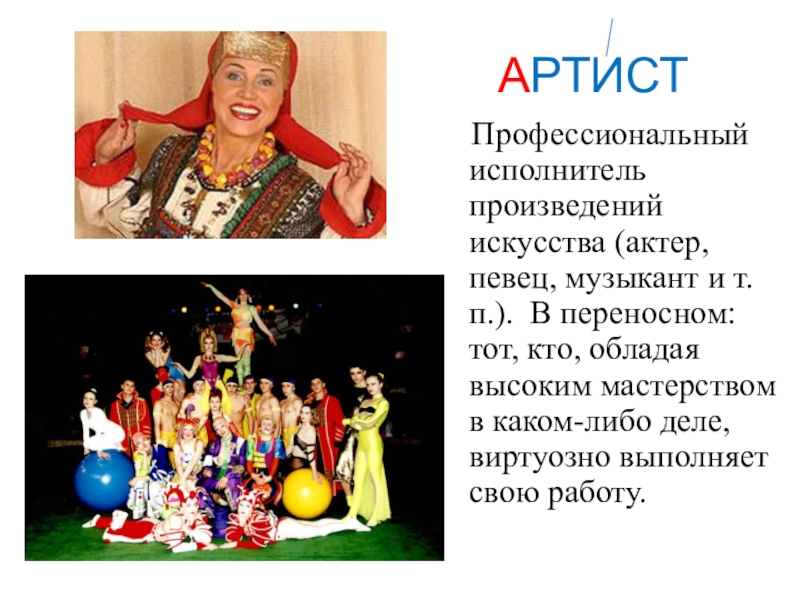 Профессиональный исполнитель произведений искусства (актер, певец, музыкант и т.п.). В переносном: тот, кто, обладая высоким мастерством в каком-либо деле, виртуозно выполняет свою работу.