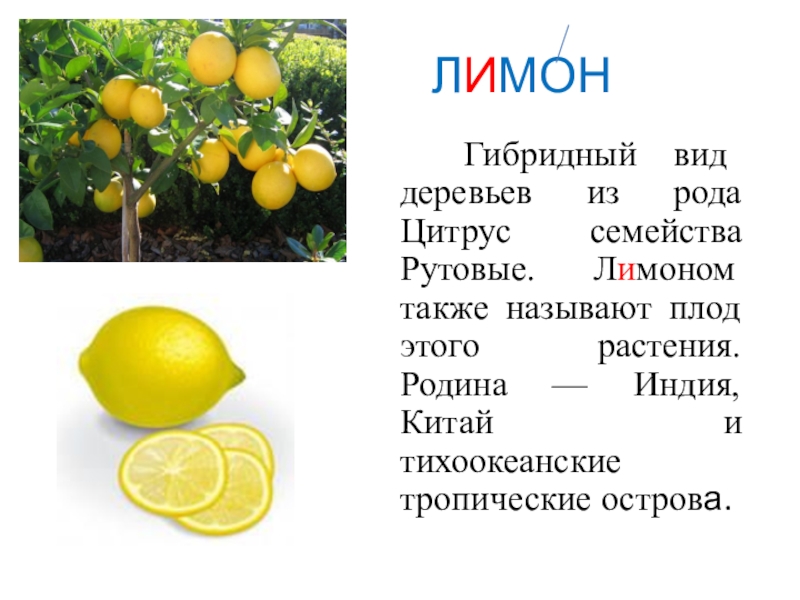 Гибридный вид деревьев из рода Цитрус семейства Рутовые. Лимоном также называют плод этого растения. Родина — Индия, Китай и тихоокеанские тропические острова.