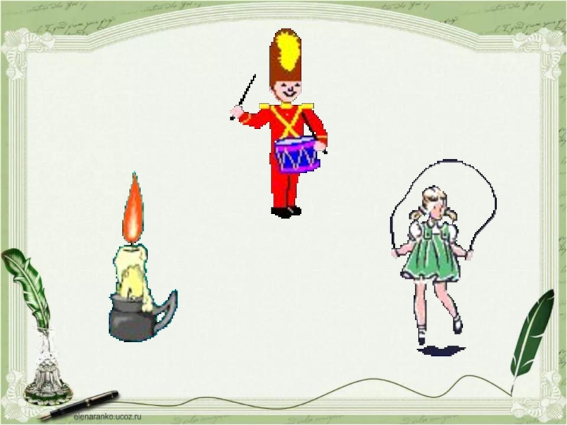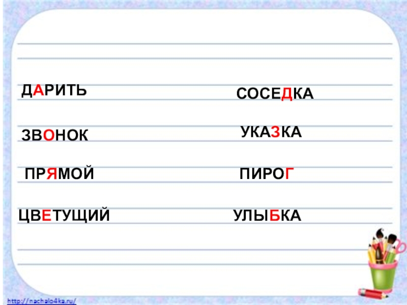 ОРФОГРАФИЧЕСКАЯ МИНУТКАД…РИТЬ, ЗВ…НОК, УКА…КА, ПИРО…, СОСЕ…КА, ПР…МОЙ, ЦВ…ТУЩИЙ, УЛЫ…КА
