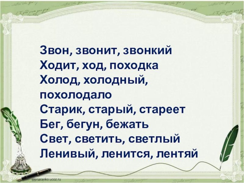 Звон, звонит, звонкийХодит, ход, походкаХолод, холодный, похолодалоСтарик, старый, стареетБег, бегун, бежатьСвет, светить, светлыйЛенивый, ленится, лентяй