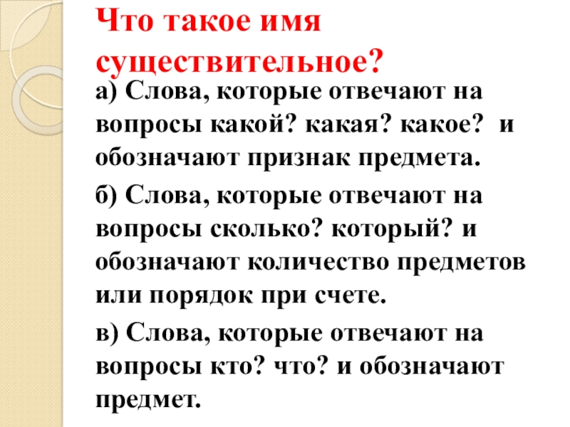 в) Слова, которые отвечают на вопросы кто? что? и обозначают предмет.