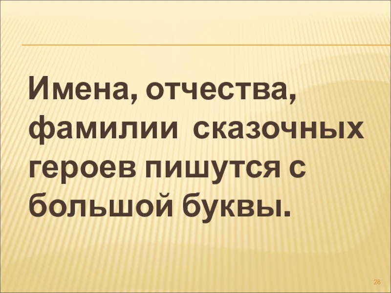Слайд 28 Имена, отчества, фамилии сказочных героев пишутся с большой буквы.