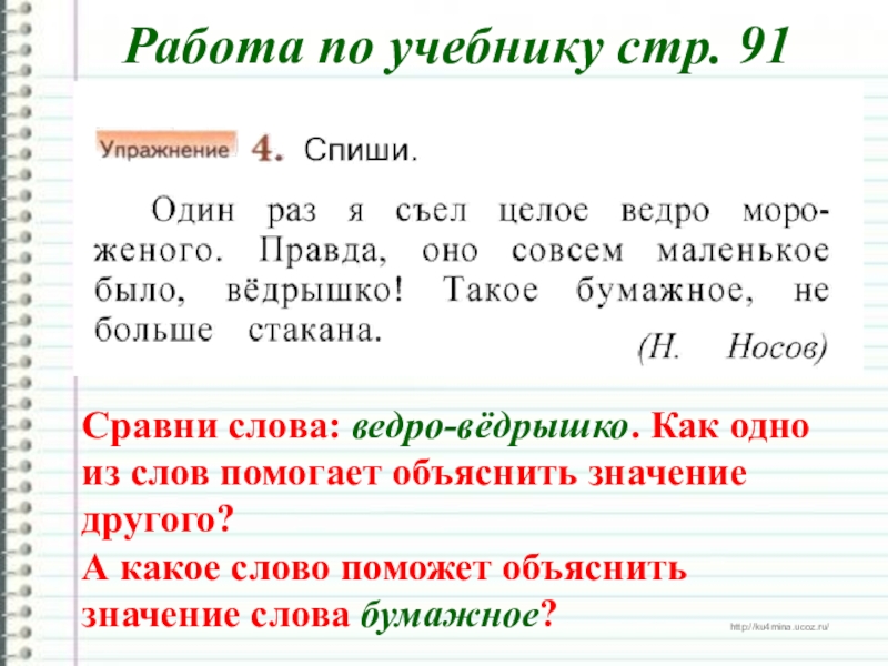 Работа по учебнику стр. 91Сравни слова: ведро-вёдрышко. Как одно из слов помогает объяснить значение другого? А какое