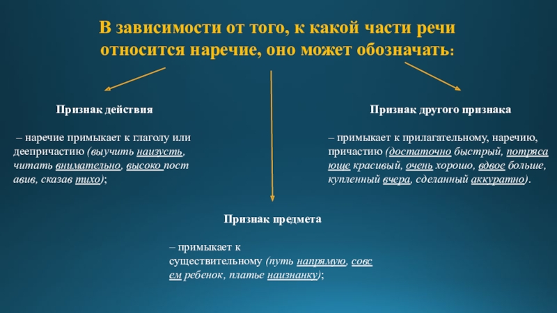 – наречие примыкает к глаголу или деепричастию (выучить наизусть, читать внимательно, высоко поставив, сказав тихо);