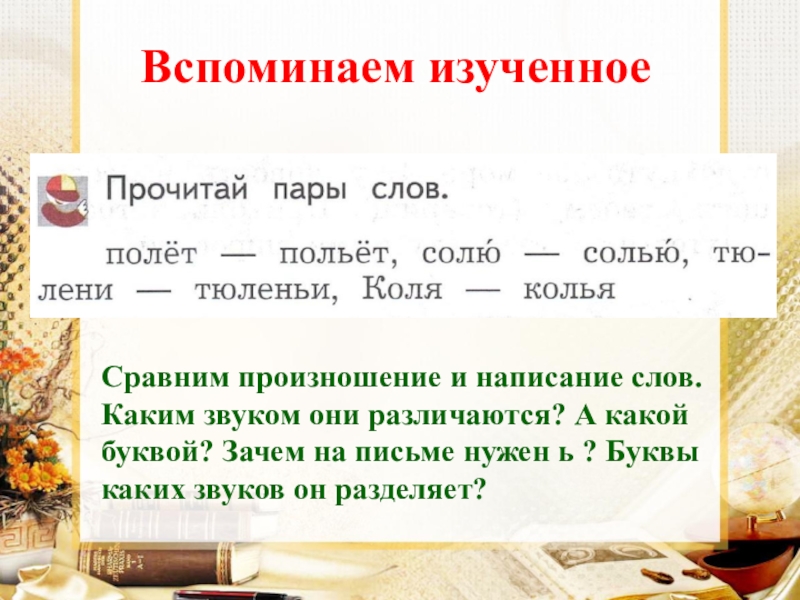 Вспоминаем изученноеСравним произношение и написание слов. Каким звуком они различаются? А какой буквой? Зачем на