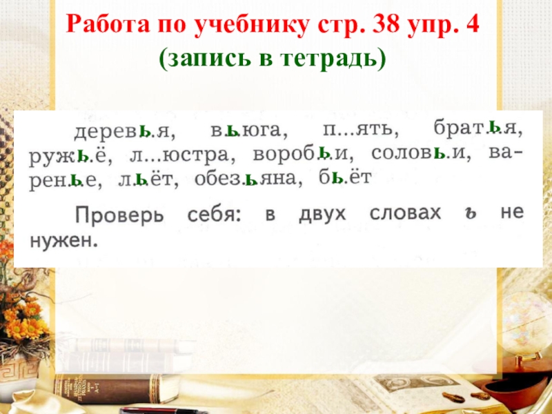Работа по учебнику стр. 38 упр. 4 (запись в тетрадь) ьььььььььь