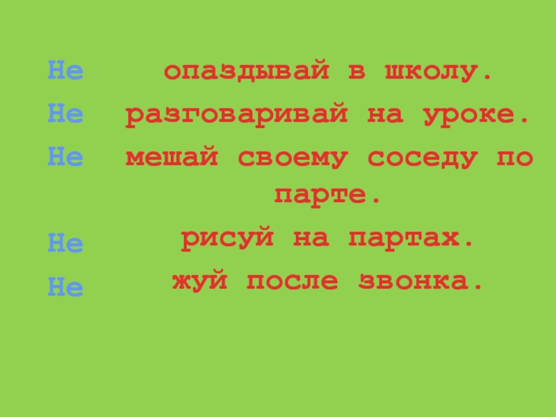 НеНеНеНеНеопаздывай в школу.разговаривай на уроке.мешай своему соседу по парте.рисуй на партах.жуй после звонка.