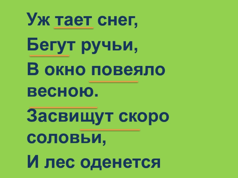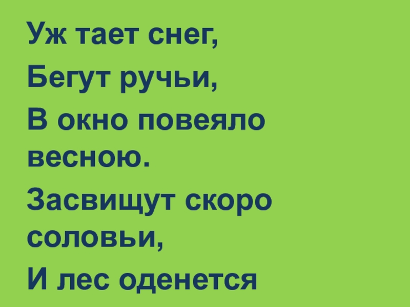 Уж тает снег,Бегут ручьи,В окно повеяло весною.Засвищут скоро соловьи,И лес оденется листвою.